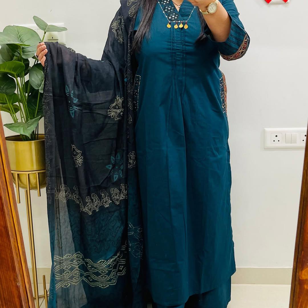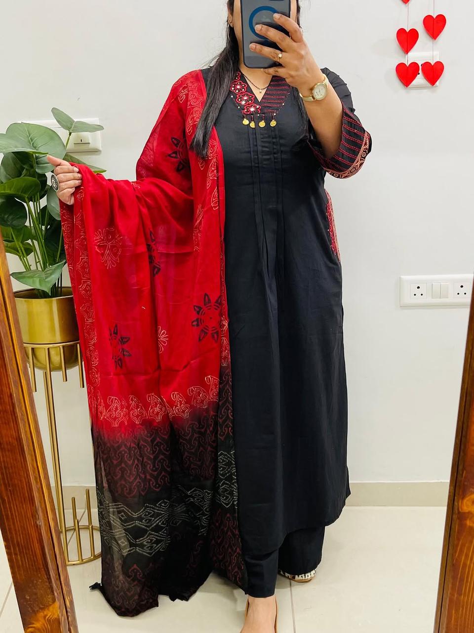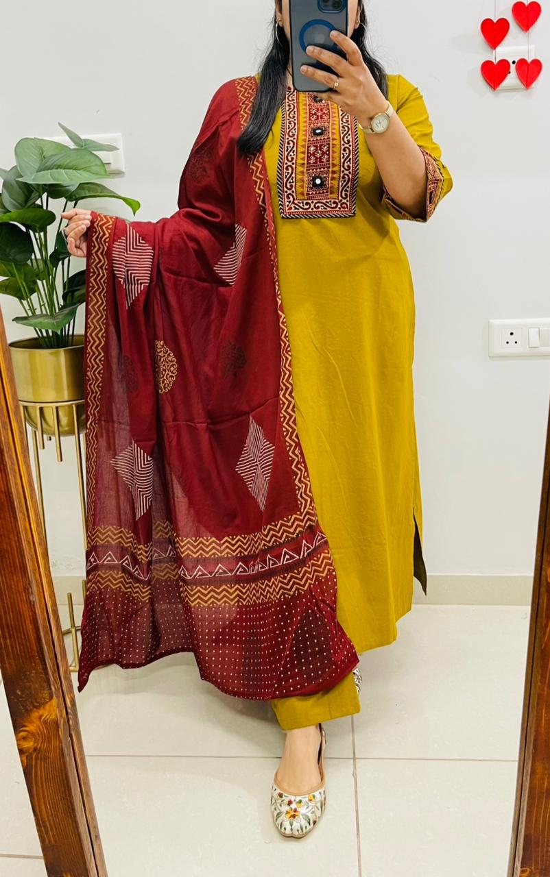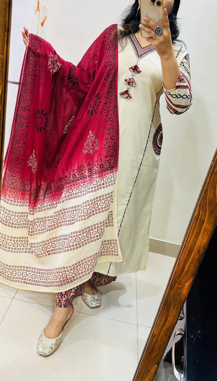 🌹🌹Pure fine Cotton fabric Kurti with Pant with cotton 100-100 Dupatta. *Nack Printex work