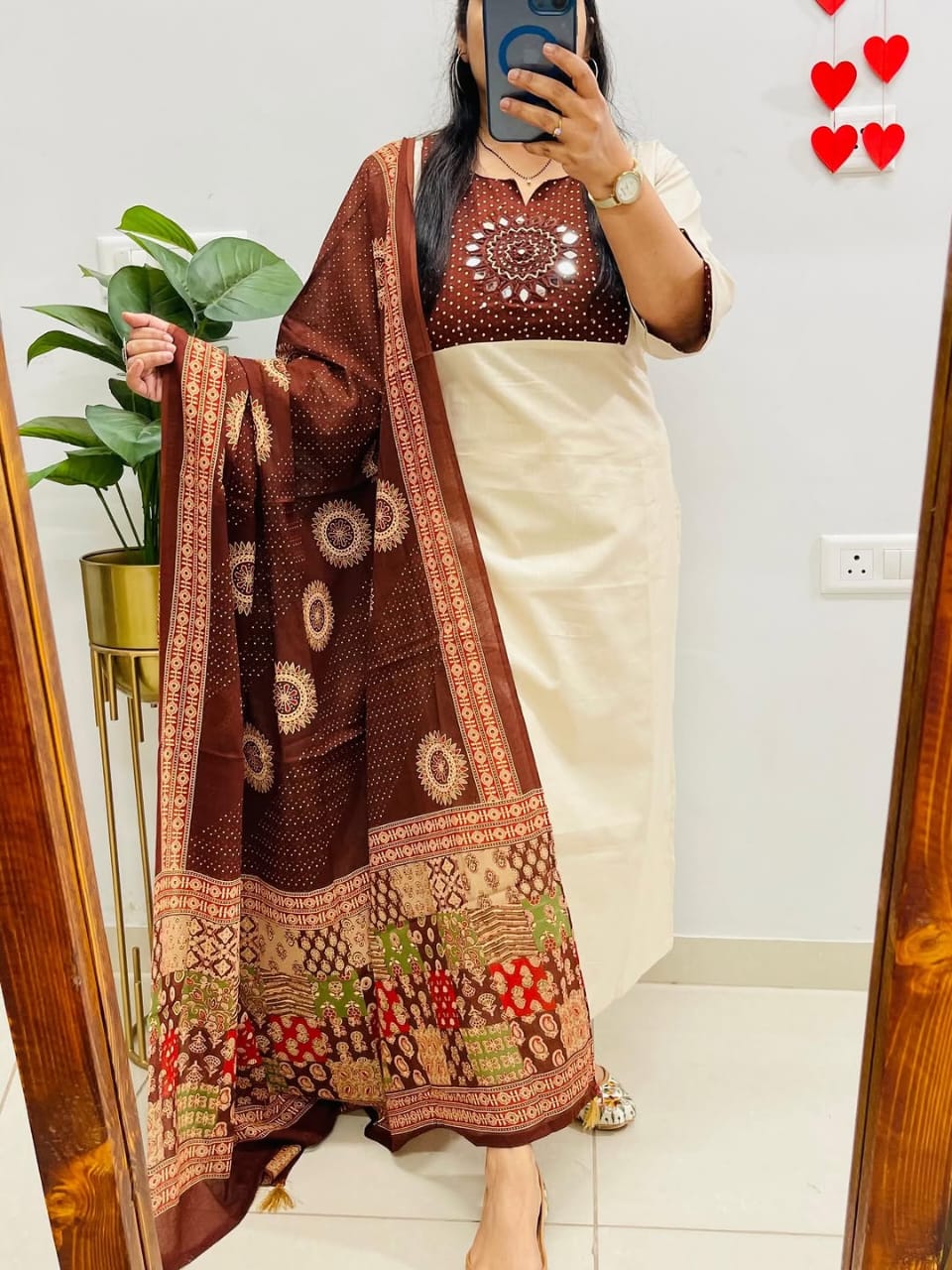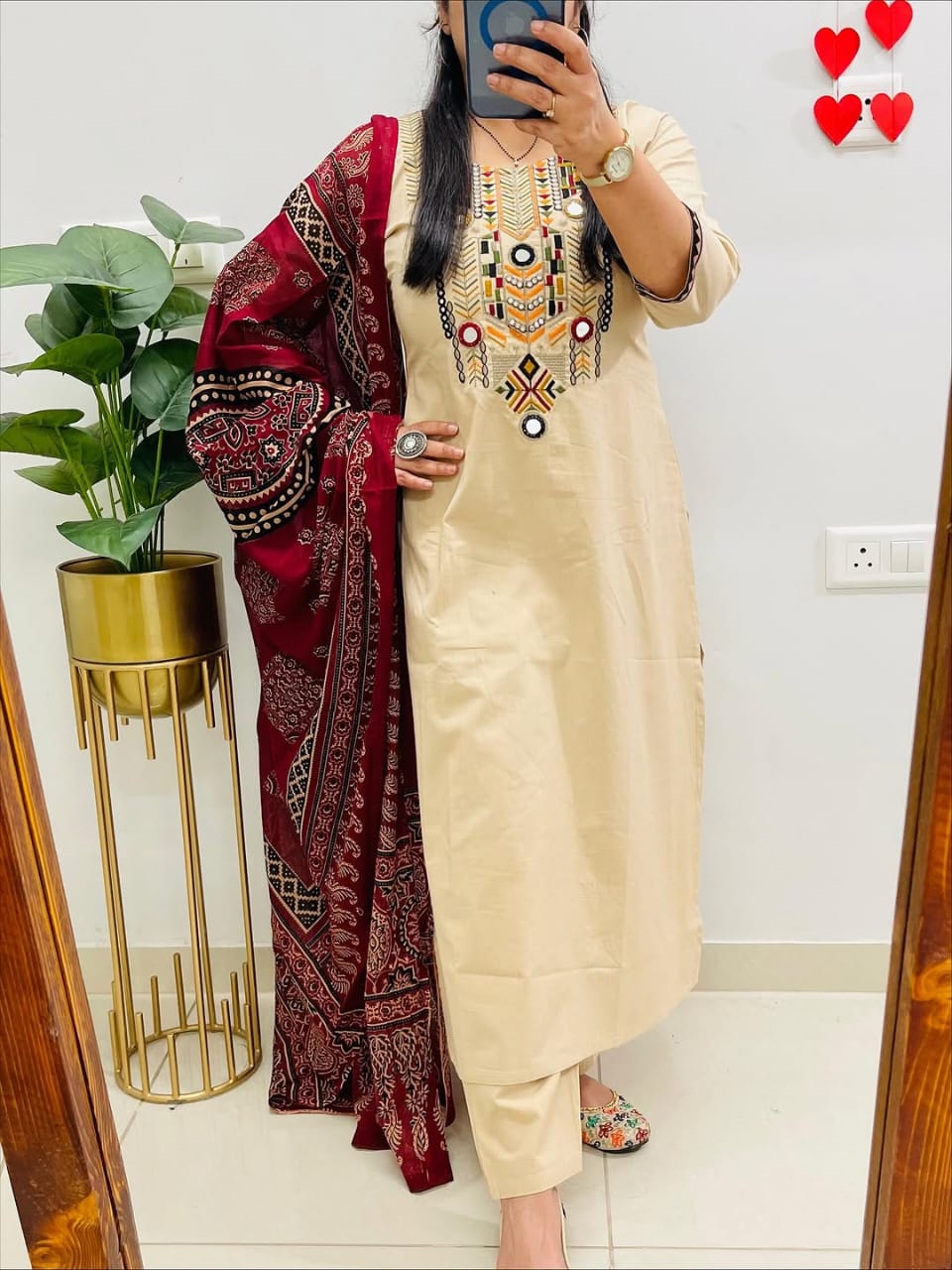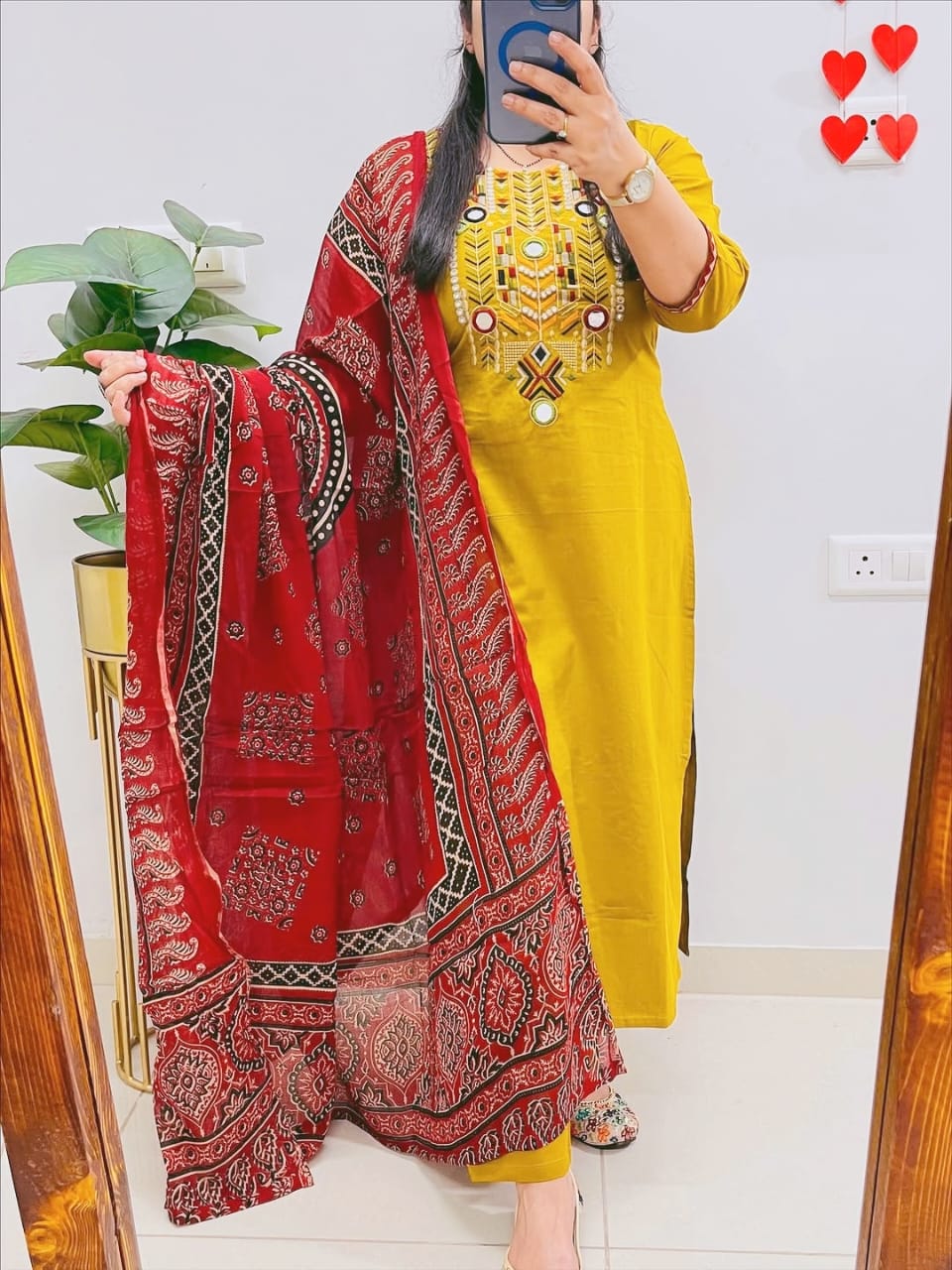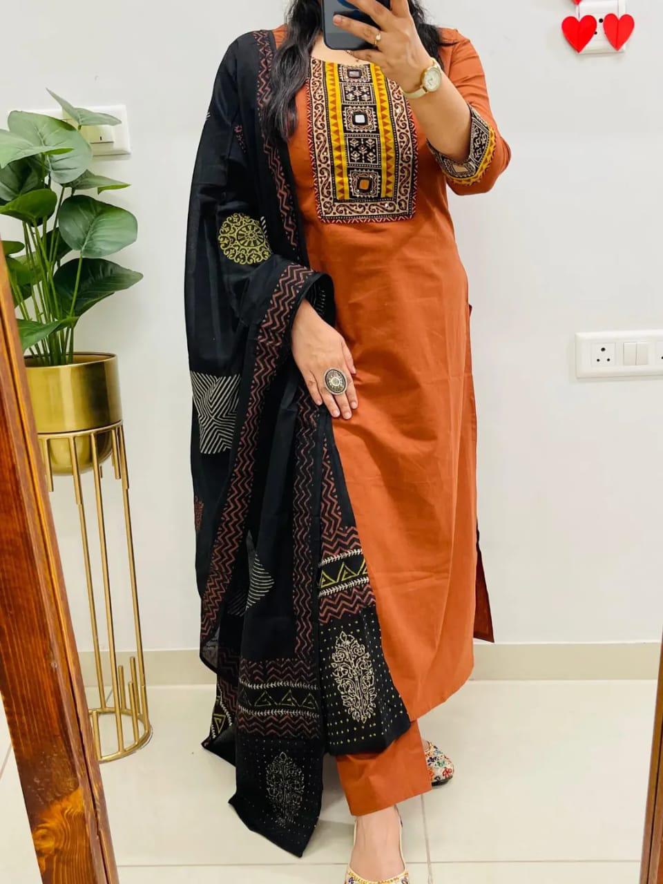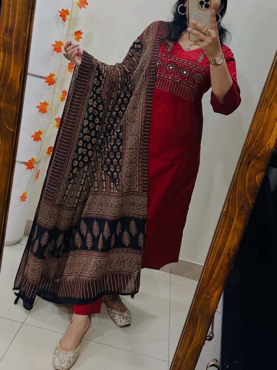 🌹🌹Pure fine Cotton fabric Kurti with Pant with cotton 100-100 Dupatta. *Nack Printex work